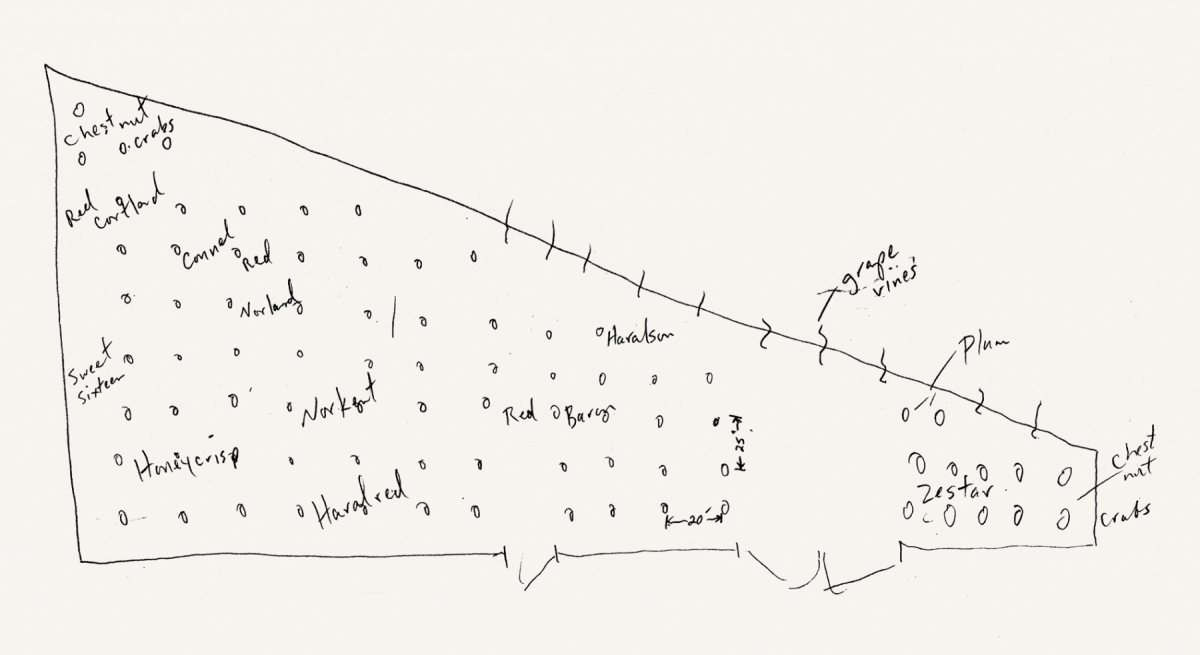Anderson farm, 2015: Keith drew this map from memory while we sat at a picnic table near the house. He said the original orchard plans from a dozen years ago probably still exist somewhere in the house, but things have changed since then anyway, so this map better reflects the current state of the orchard.