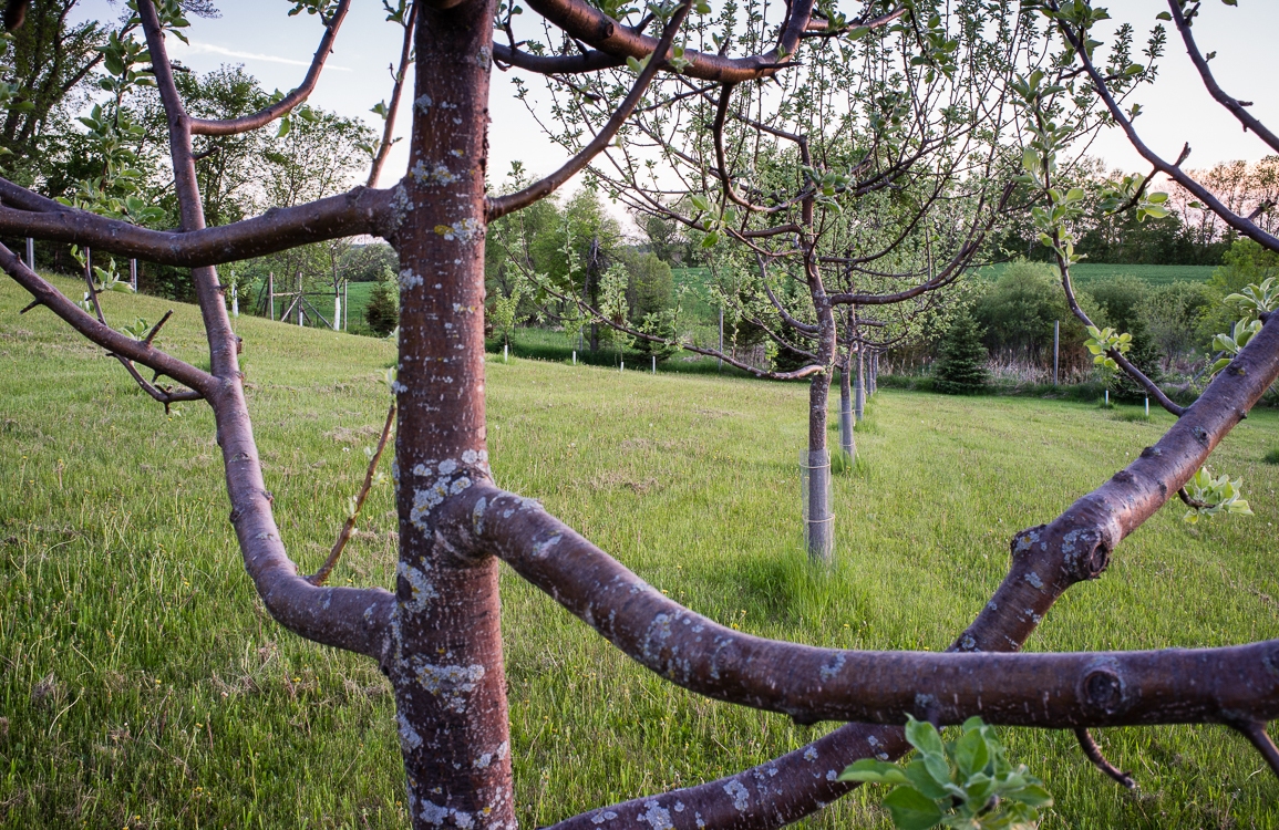 Anderson farm, May 29, 2014: I enjoy photographing trees in the brief, intense moment when the new leaves come. They have a job to do and don’t waste time getting to it. Time is of the essence for them, just as in farming; the inflexible cycles of nature shape the ethics and perspectives of rural workers.